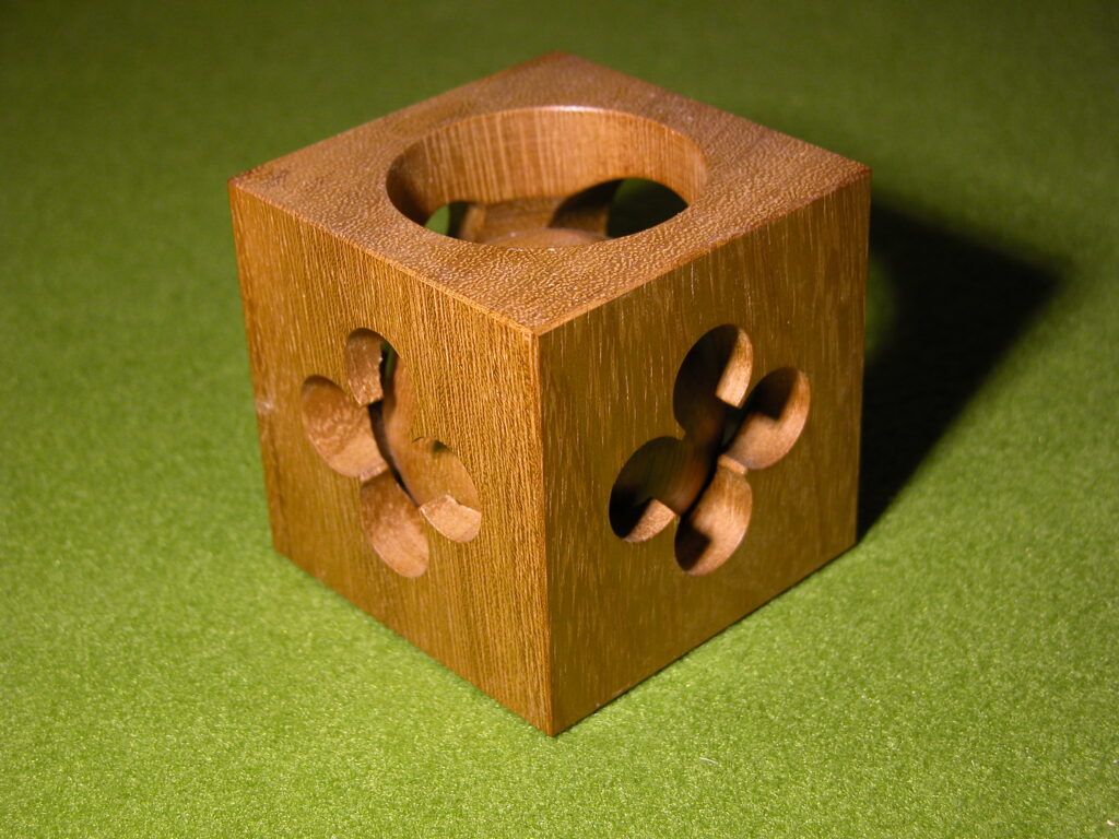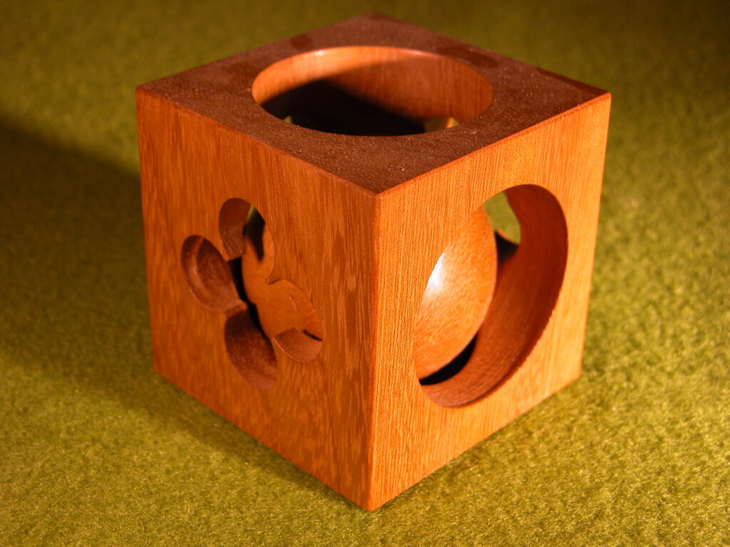 Cubo en Iroko de 70 mm. Esfera interior elaborada desde 3 caras con agujeros redondos y otras tres con ventanas en cruz.